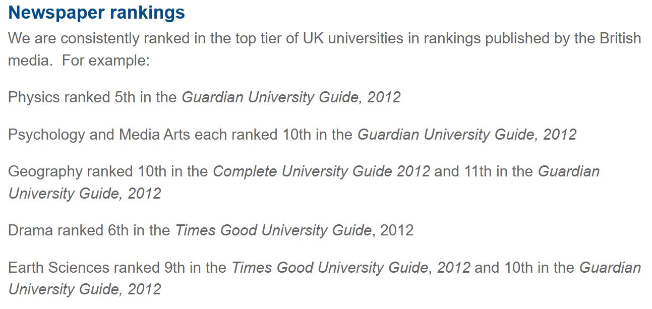 The Guardian’s rankings are of particular note for Royal Holloway because, many years ago, Royal Holloway used them on its website as accolades for its performance as the figure below shows: