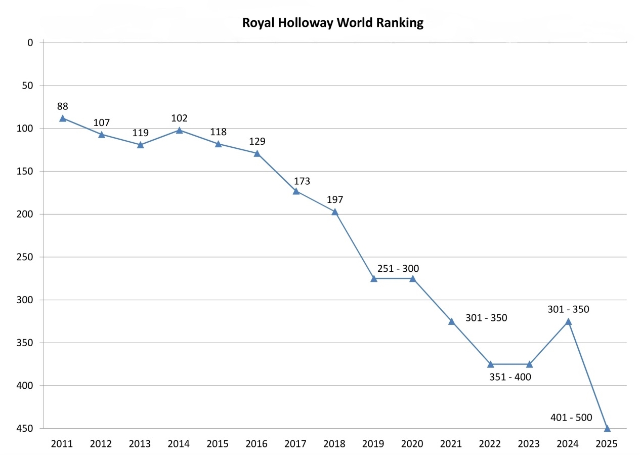 As our graph above shows, RHUL’s ranking – despite an encouraging upward tick last year (the only improvement in the last eleven years) – has now sunk even further and currently languishes somewhere between 401st and 500th in the world.